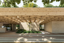 Enfin, l'ensemble est couvert par une toiture bois tridimensionnelle percée par des patios fleuris, tantôt ouverts tantôt couverts par des ombrières créant une ambiance végétale intacte.